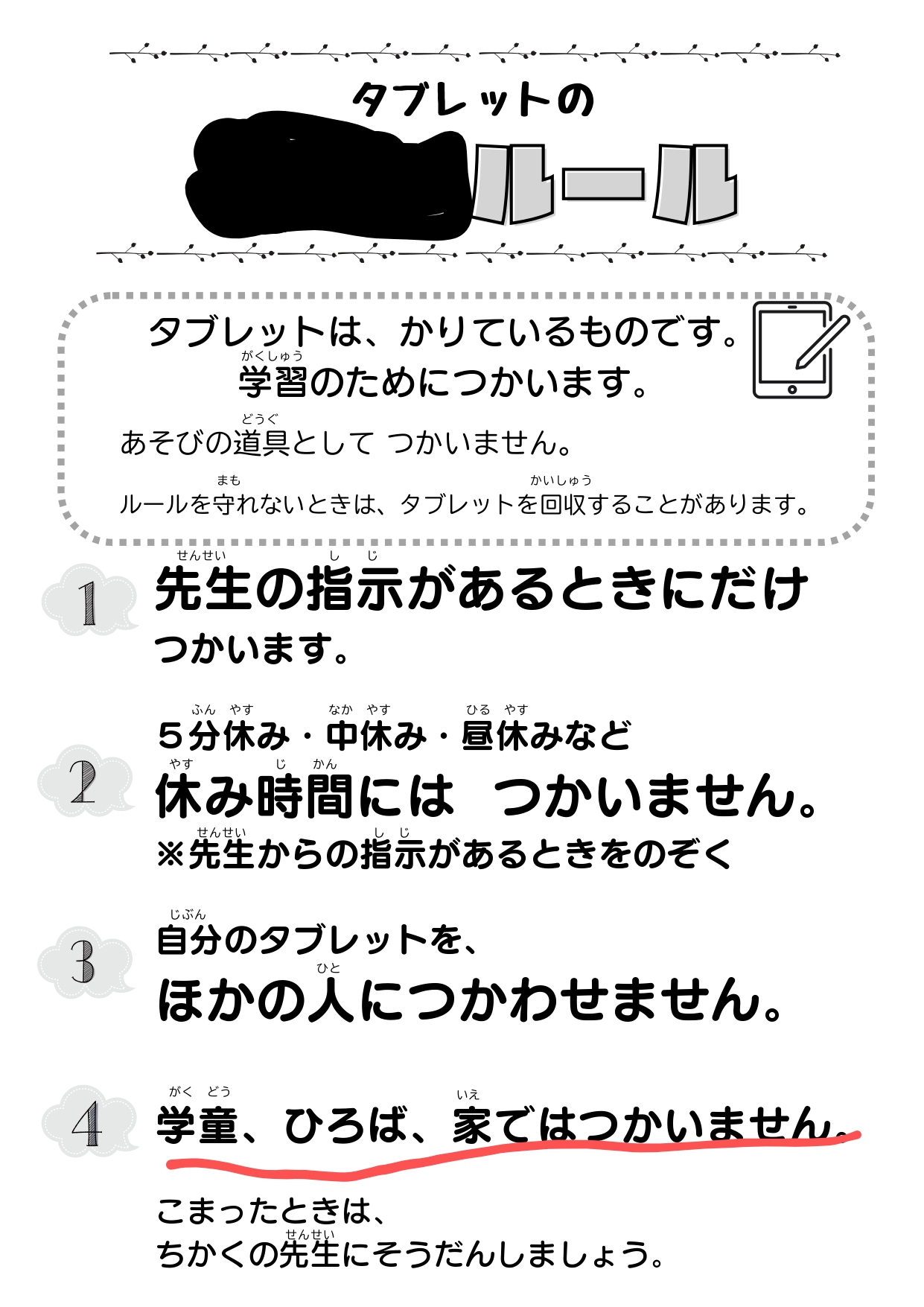 結局必要なのはいわゆる「ネットリテラシー」と「ITリテラシー」の基本であって、決して「タブレットは先生の指示があるときだけ使いましょう」という薄気味悪い利用制限ではないはずです。
